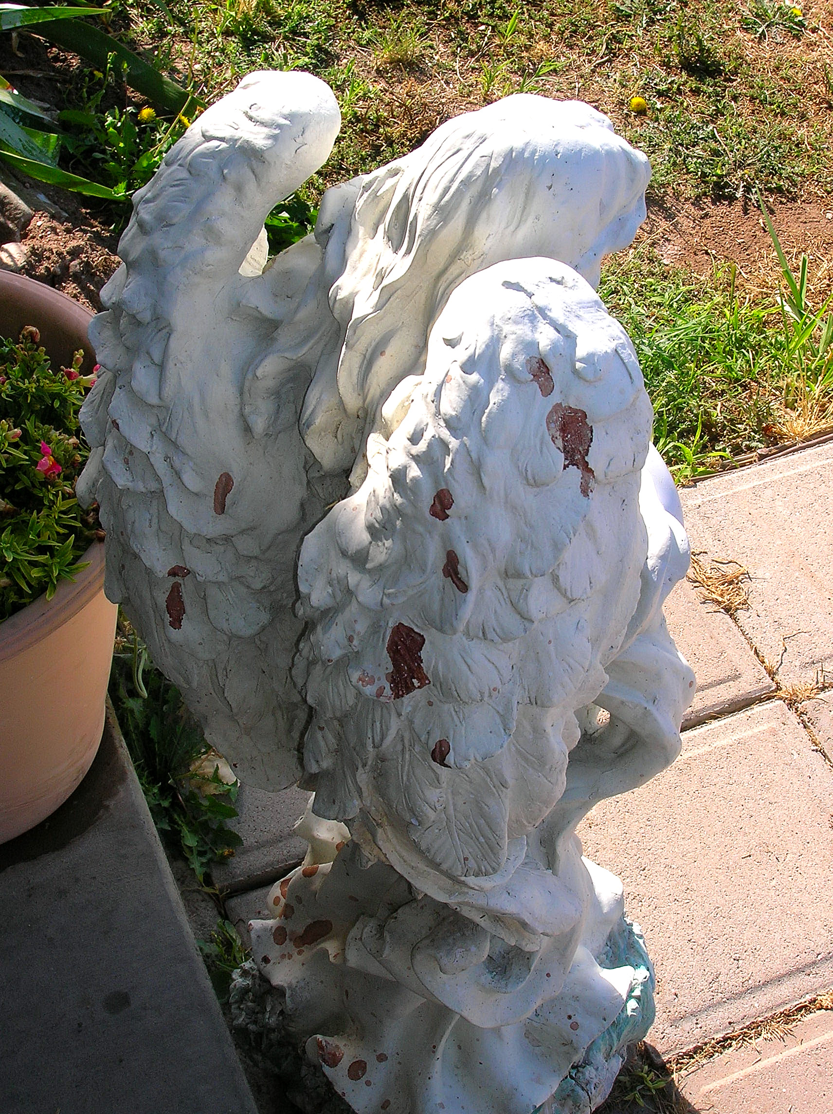 A week or so later, during devotional time, I noticed something on one of my 3’ angels that stood in the flowerbed by the porch.  I walked up to get a better view and it took my breath away.  A careless sling of a brush had splashed the angel with what looked like large drops of blood.  “Jesus, Your Blood.”